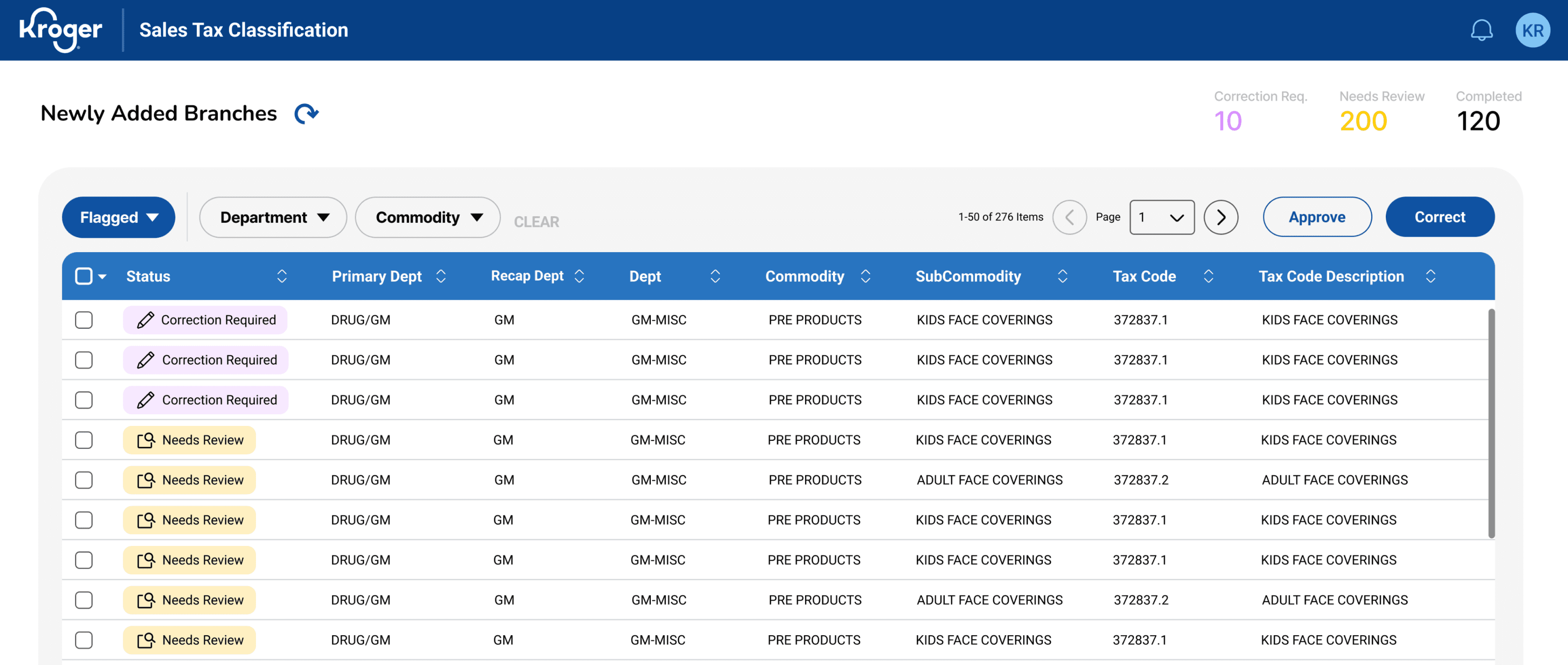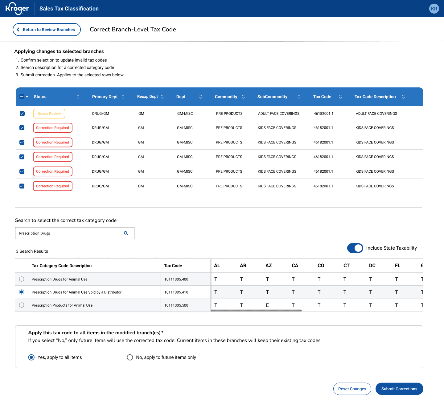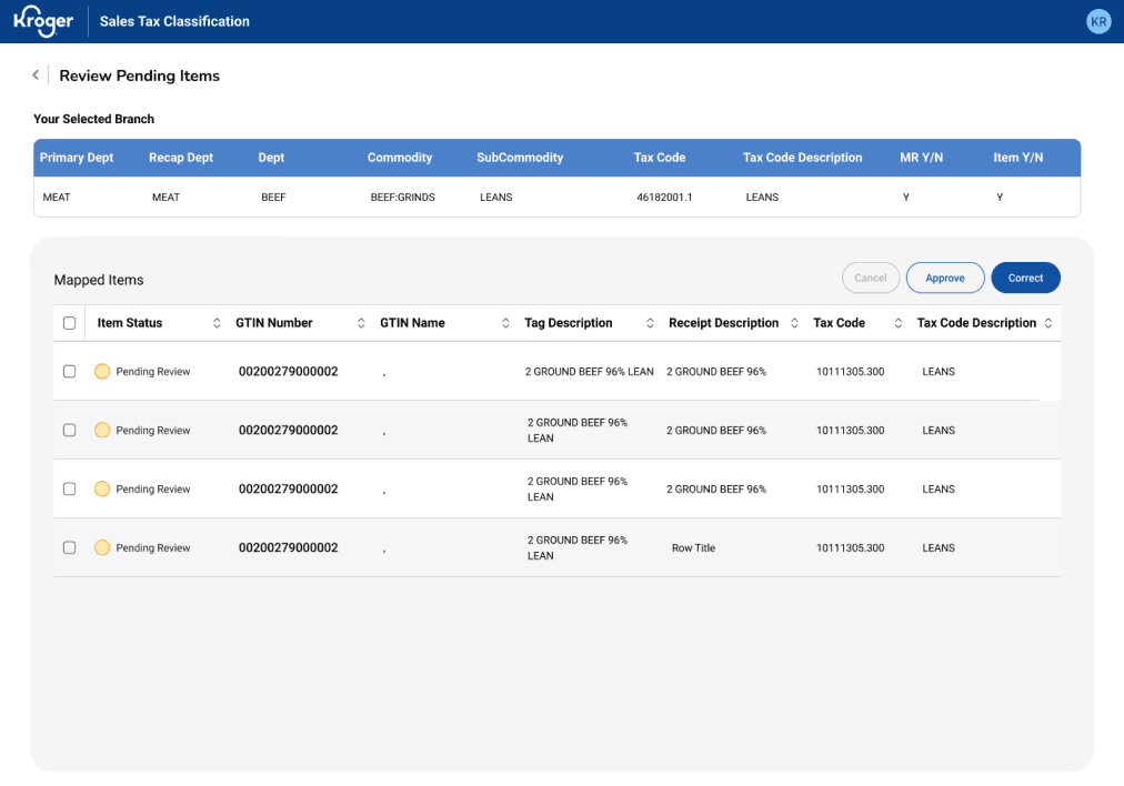 I owned the research and product design of a management platform to resolve tax code inconsistencies for Kroger’s incoming products by aligning user mental models with system requirements, reducing 15% tax code errors.