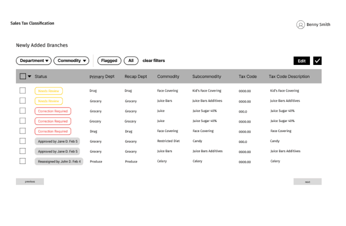 Create clear status indicators for items needing a new tax code v. those requiring correction.