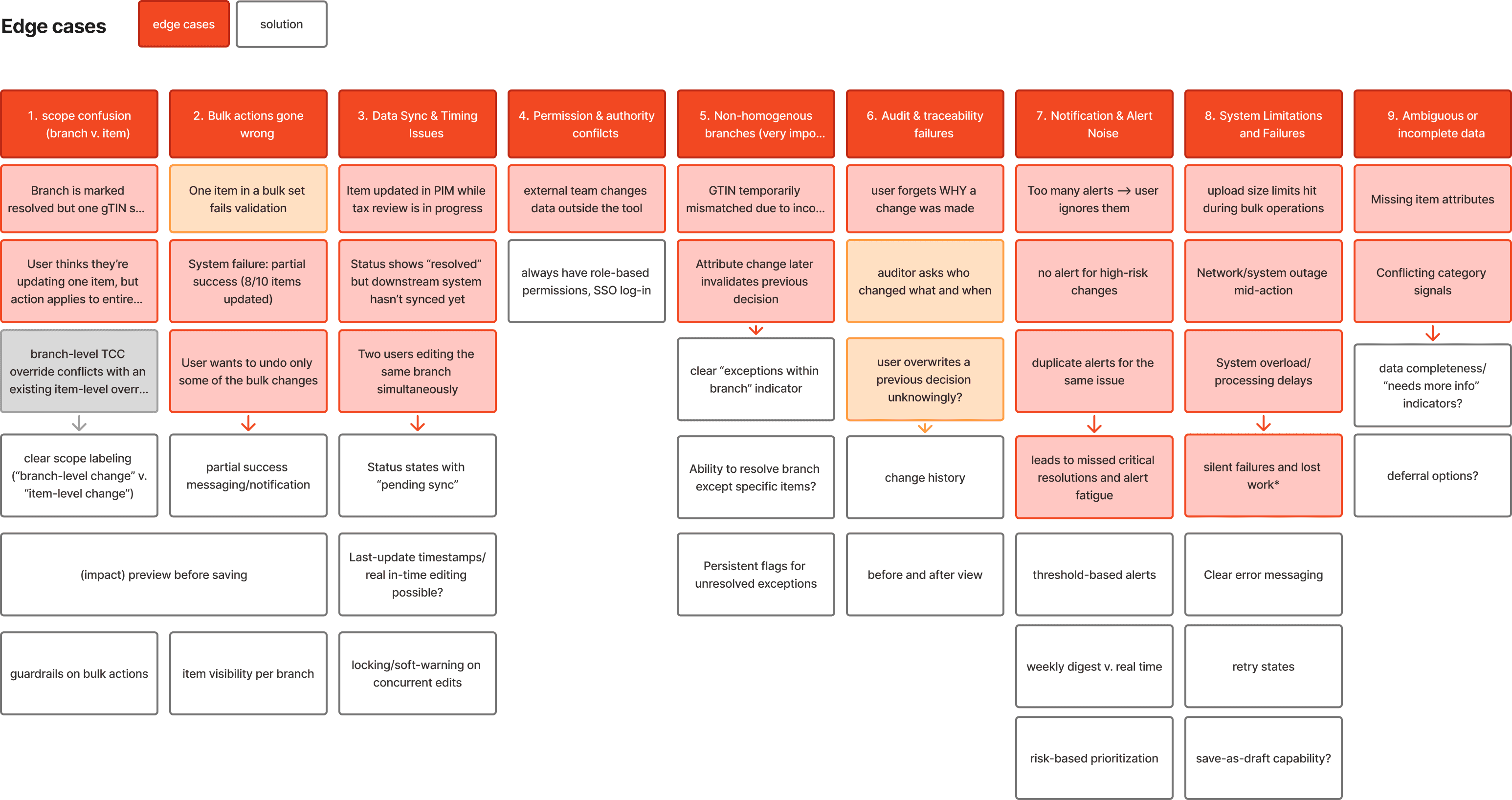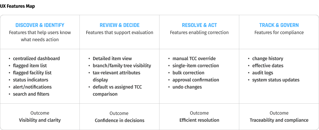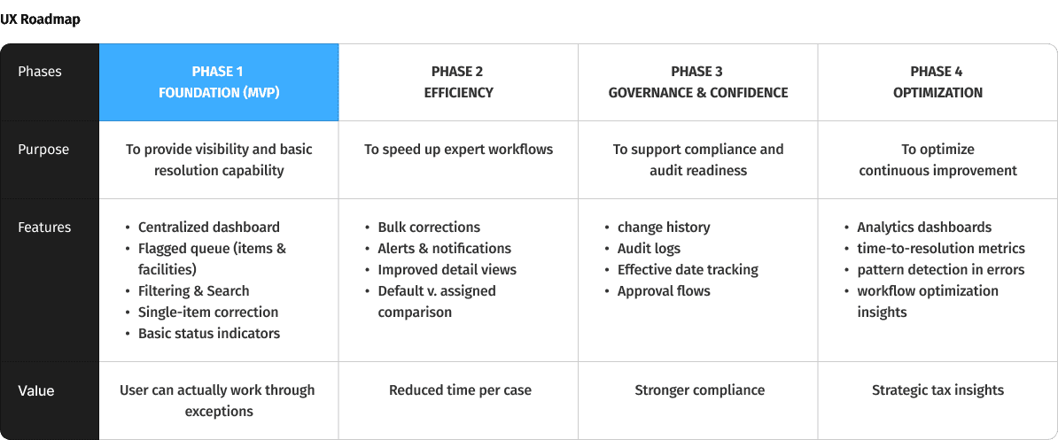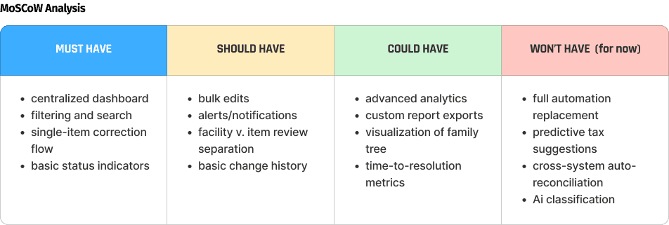 Through several stakeholder and user interviews, I discovered the challenge wasn’t tax calculation but managing exceptions at scale. Experts were already working across multiple systems and with limited visibility, users had to resort to manual reconciliation using only excel files as well as these other main pain points: