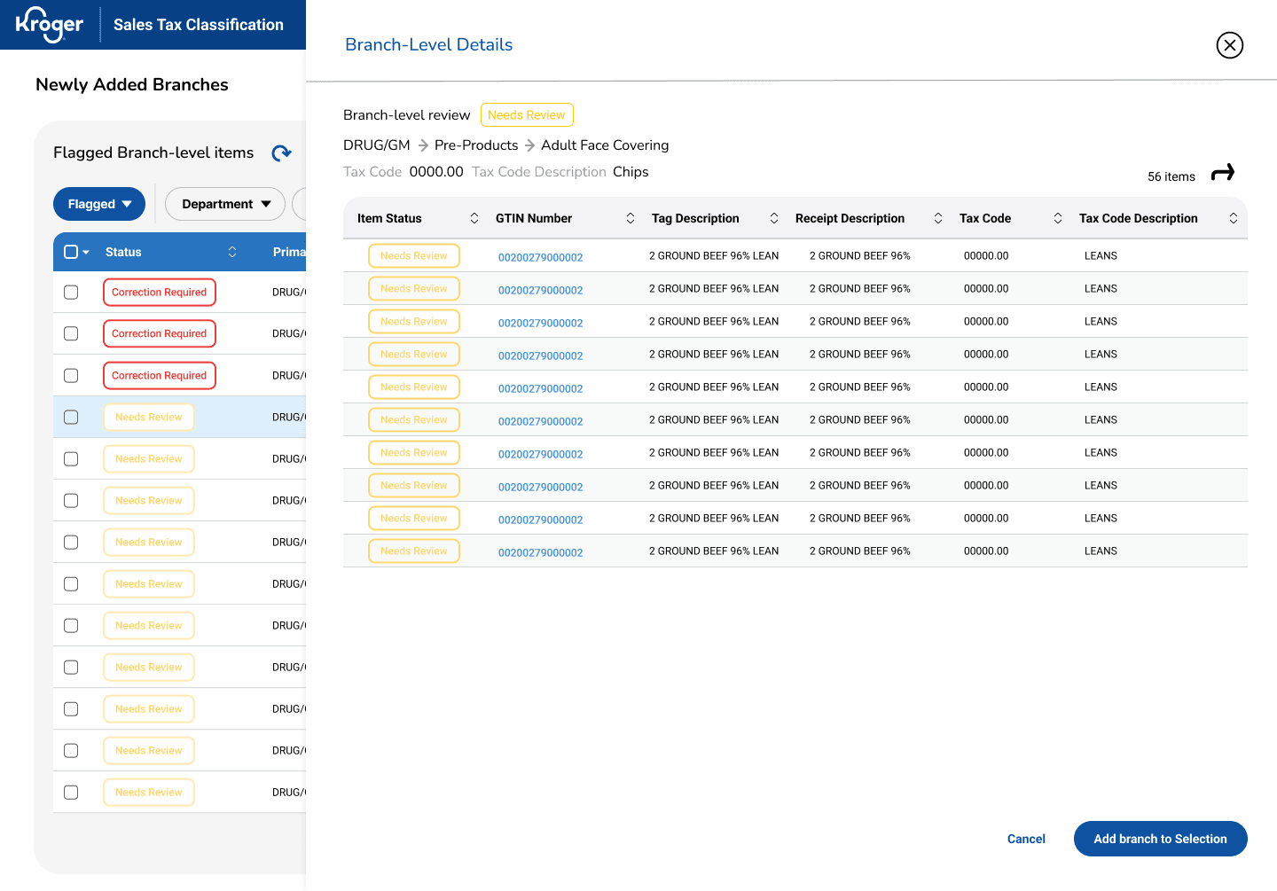 Working with predetermined data hierarchies and interaction patterns shaped our iterative approach. Our data structure required a branch-to-item hierarchy, meaning users couldn't immediately see all flagged exceptions across the system. Instead, they had to navigate through branch-level rows to access the item-level cases within them.