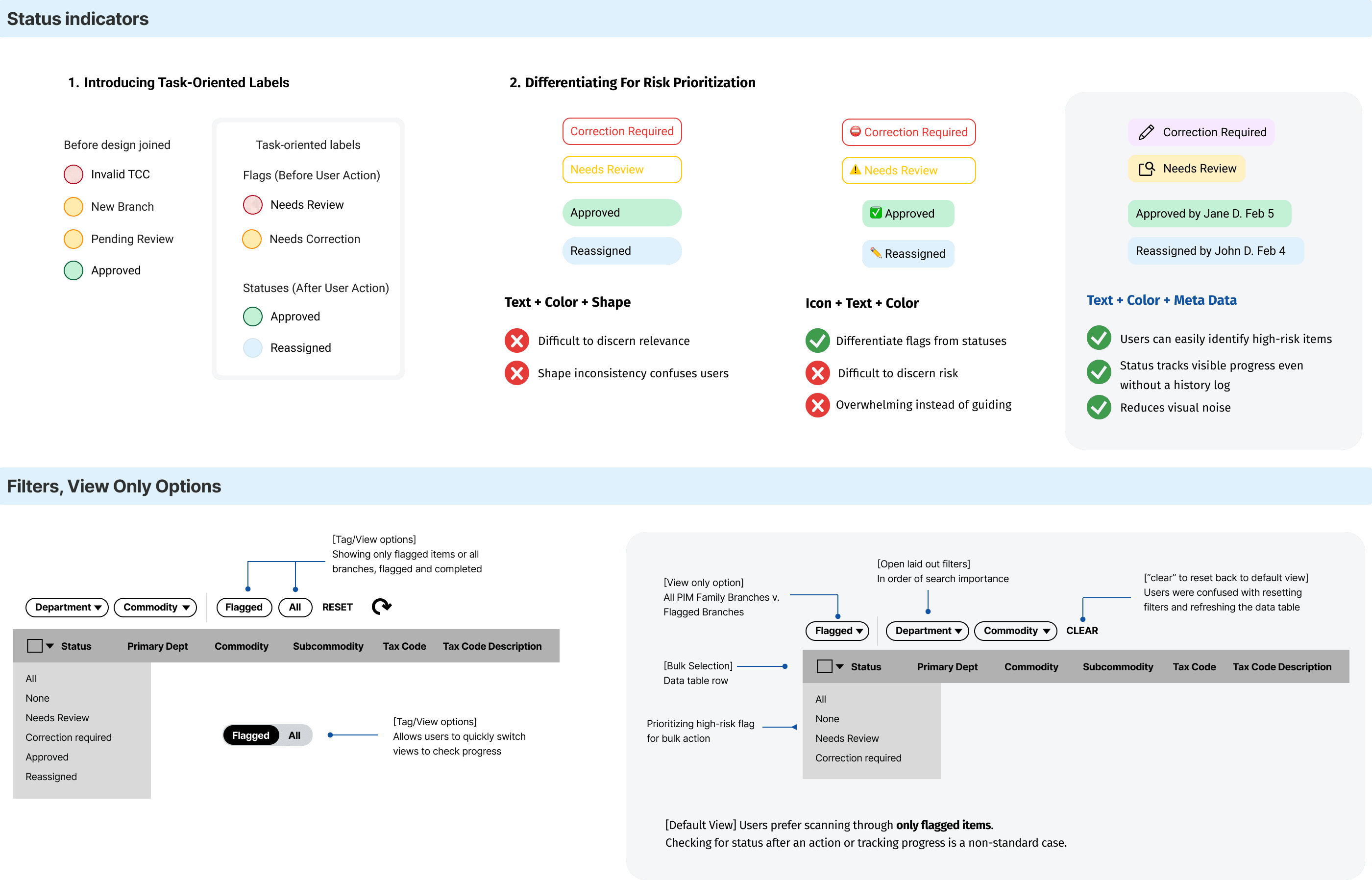 For users processing hundreds of items daily, we optimized pattern recognition with a visual flagging system that surfaces invalid tax codes immediately and a data table design for fast batch decision-making rather than forcing individual evaluation of every row. Marked below are key affordances allowing quick decision-making for high-volume workflows.