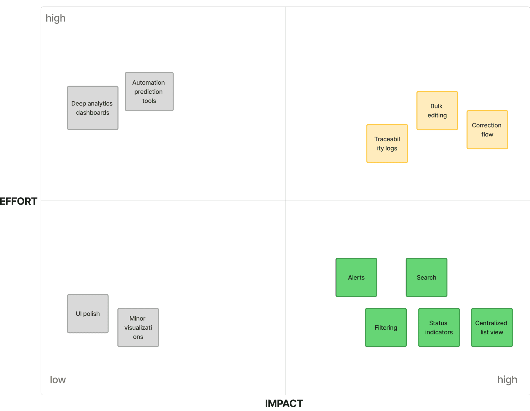 Given timeline and integration constraints, with my PM and 2 Tech Leads, I prioritized these features to improve expert visibility and decision-making first for MVP before pursuing any deeper automation.